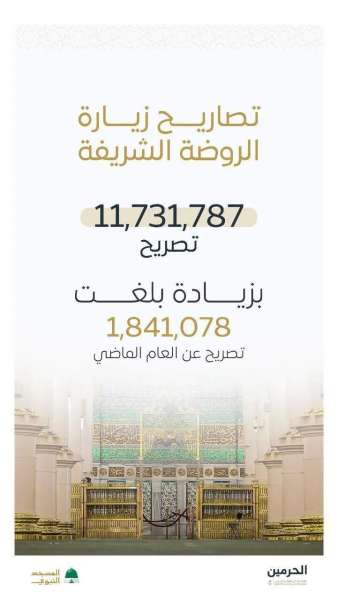 وبيّنت الإحصائية أن أكثر من 11 مليون مصلي ومصلية أدوا الصلاة في الروضة الشريفة بالمسجد النبوي، وشرفوا بالسلام على الرسول المصطفى - صلى الله عليه وسلم - وصاحبيه - رضوان الله عليهما - خلال العام الماضي، بزيادة بلغت أكثر من 1,8 مليون مصلي، وفق ترتيبات الحجز المسبق عبر تطبيق "نسك" التي تراعي الطاقة الاستيعابية للروضة الشريفة، وتنظيم الدخول خلال الأوقات المخصصة للرجال والنساء، وذلك ضمن منظومة الخدمات الإرشادية والتنظيمية التي تقدمها الهيئة للعناية بالمصلين والزائرين، وتوفير سبل الرعاية والخدمات التي تمكّنهم من أداء العبادات بيسر وراحة.