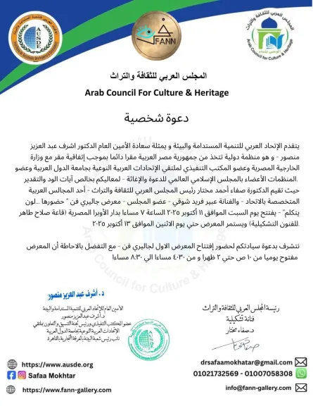 دعوة للكاتب الصحفي محمد حلمي رئيس تحرير صحيفة وموقع النور نيوز والنجم الرياضي المجلس العربي للثقافة والتراث أحد المجالس المتخصصة بالاتحاد العربي للتنمية المستدامة والبيئة لحضور حفل افتتاح مساء السبت ١١ أكتوبر ٢٠٢٥ معرض «حضورها… لون يتكلم» بقاعة صلاح طاهر للفنون التشكيلية بدار الأوبرا المصرية،