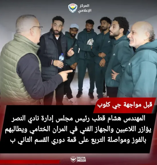 المهندس هشام قطب، رئيس نادي النصر الرياضي، يؤازر اللاعبين والجهاز الفني في المران الختامي قبل مواجهة فريق جي كلوب، ويطالبهم بالفوز ومواصلة التربع على قمة دوري القسم الثاني (ب).
