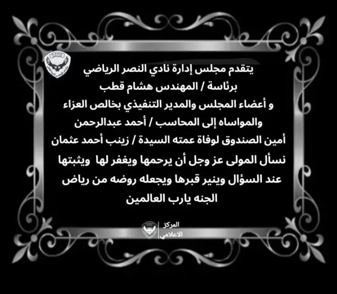يتقدم الكاتب الصحفي محمد حلمي رئيس تحرير صحيفة وموقع النور نيوز بخالص العزاء للمحاسب أحمد عبد الرحمن امين الصندوق بنادى النصر الرياضي..في وفاة المرحومه الحاجة زينب أحمد عمته والعزاء علي القبر وانا لله وانا اليه راجعون عظم الله اجركم واحسن الله عزاكم وغفر الله لميتكم واسكنه فسيح جناته يارب العالمين