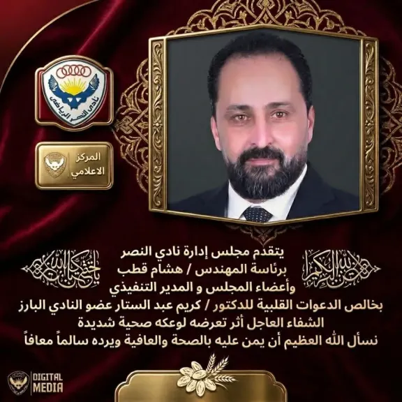 تقدم الكاتب الصحفي محمد حلمي، رئيس تحرير صحيفة وموقع النور نيوز والنجم الرياضي، بخالص التهنئة إلى الدكتور كريم عبد الستار، متمنيًا له الشفاء العاجل ودوام الصحة والعافية.