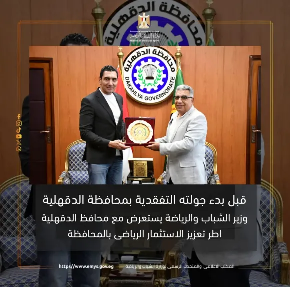 ناقش وزير الشباب والرياضة ومحافظ الدقهلية خلال اللقاء عدداً من الملفات المتعلقة بالمنشآت الشبابية والرياضية داخل المحافظة، إلى جانب آليات رفع كفاءة مراكز الشباب والأندية، وتحسين جودة الخدمات المقدمة للنشء والشباب.